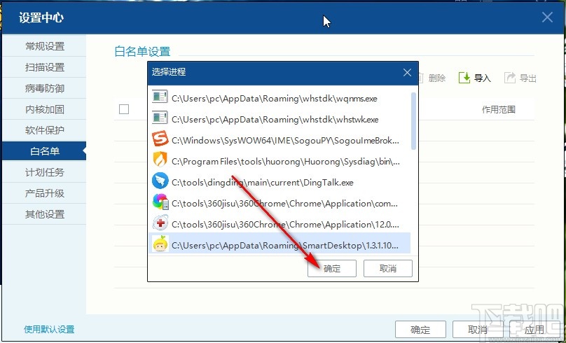 5.点击选择从进程添加的话会打开一个选择进程的界面,选中想要设置为白名单的进程之后,点击确定按钮即可添加。