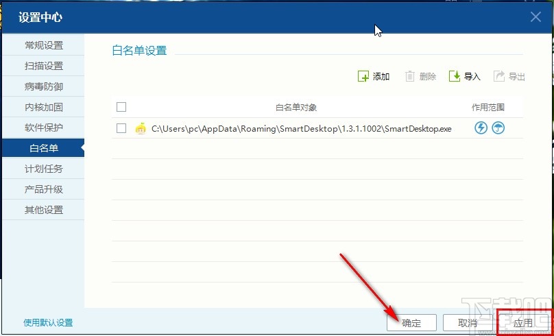 6.成功添加到软件界面之后,我们先点击右下角的应用按钮,应用之后再点击确定按钮即可完成白名单的添加操作。