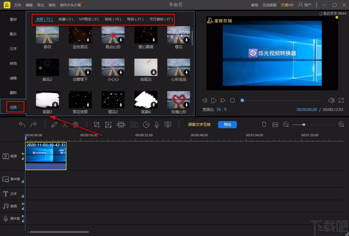 5.紧接着我们在界面上找到需要添加到视频中的动画,点击动画素材右下角的下载按钮将其下载下来。