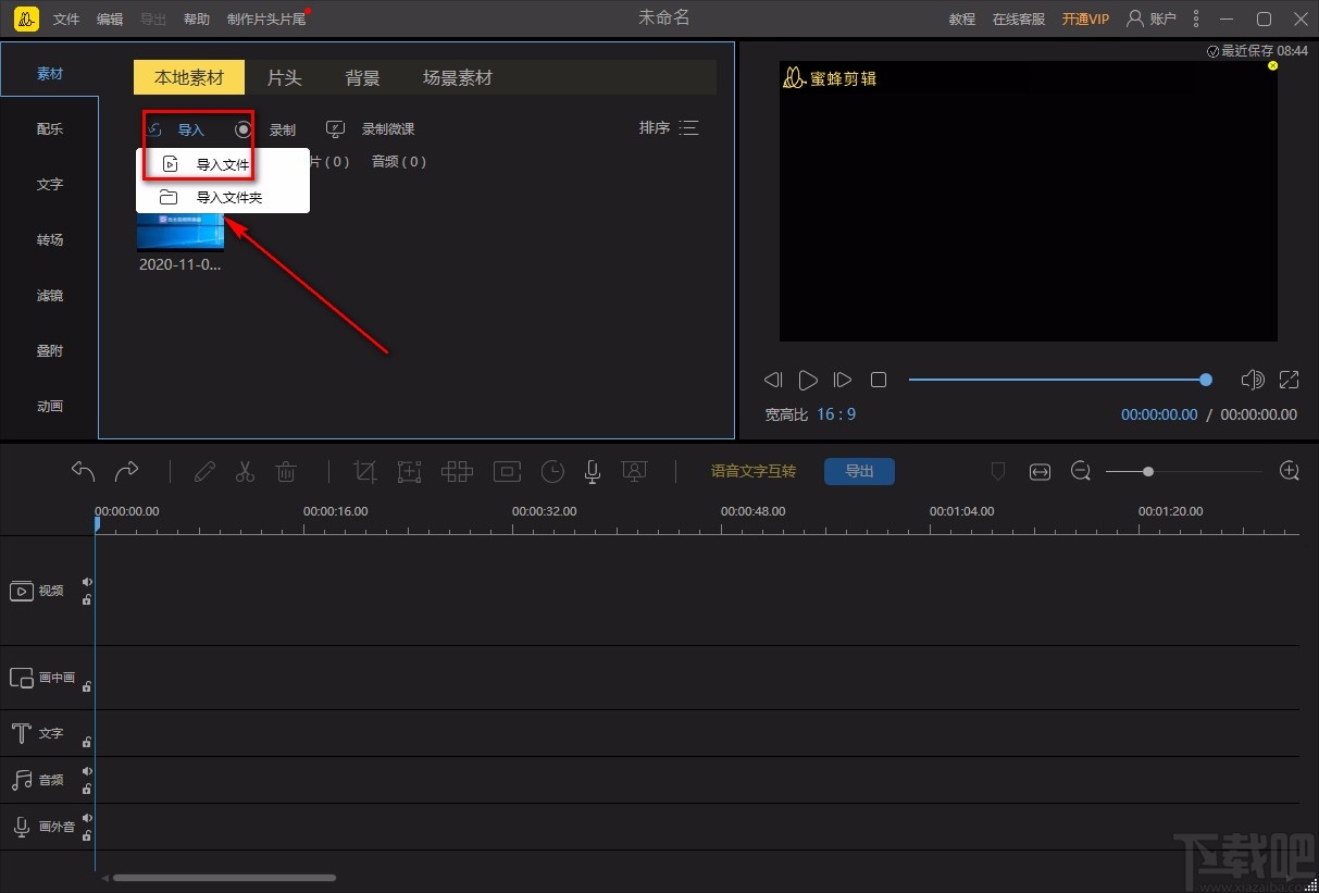 1.首先打开软件,我们在界面左上方点击“导入”按钮,其下方会出现一个下拉框,我们在下拉框中选择“导入文件”选项。