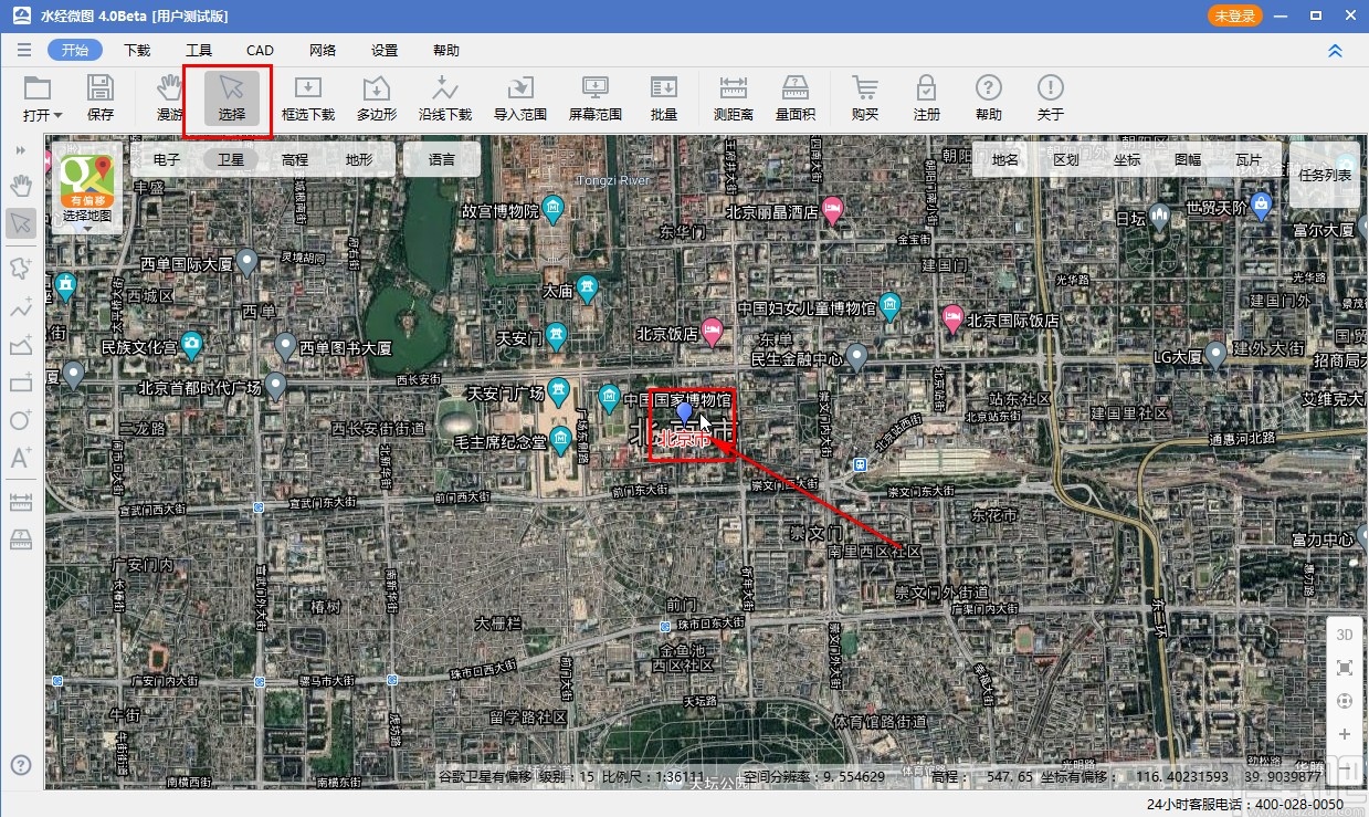 3.点击搜索地点坐标之后,接下来下一步我们可以看到搜索到的地点位置,然后点击上方的选择工具,然后再点击搜索到的地点位置的标识,如下图中所示。