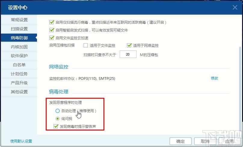 4.进入到病毒防御的设置界面之后,滑动到最下方就可以看到有病毒处理这个功能模块了,然后我们可以看到其中有一个自动处理选项,选择为自动处理。