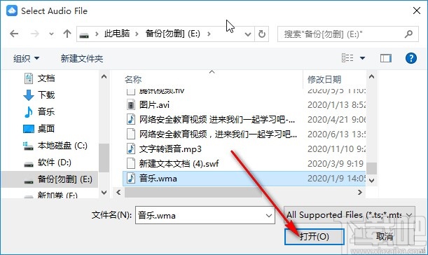 4.点击这个加号图标之后,就会出现一个选择文件的界面了,在这个界面中我们选中想要添加为背景音乐的音频文件之后,点击打开按钮。