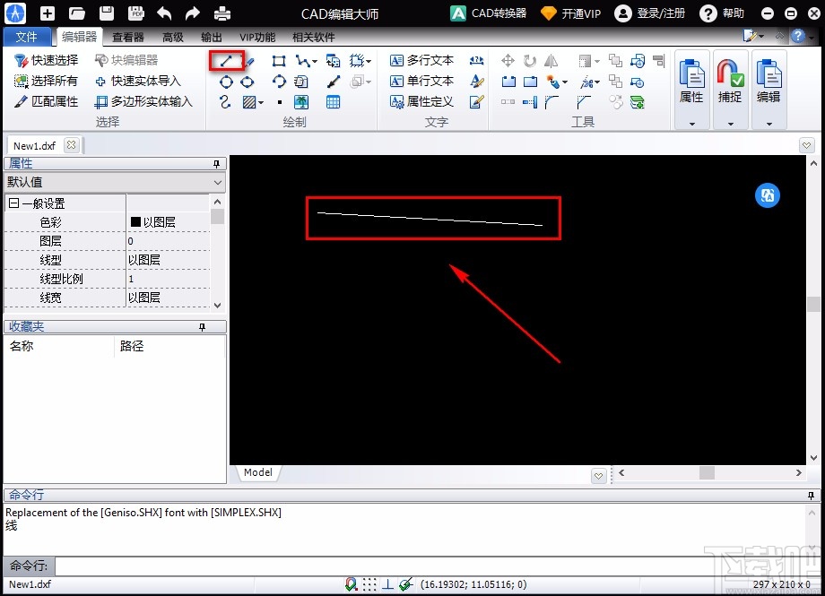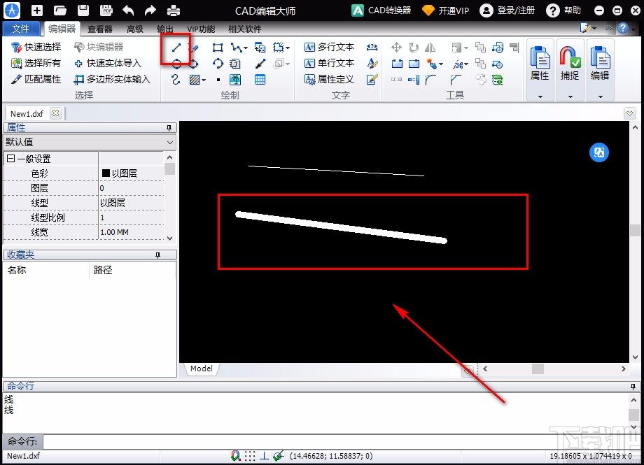 2.接着我们在界面上方找到线命令按钮,点击该按钮后,再按住鼠标左键不放,同时移动鼠标,在绘制区域绘制出一条直线,这时候可以发现这条直线的宽度是软件默认的宽度。
