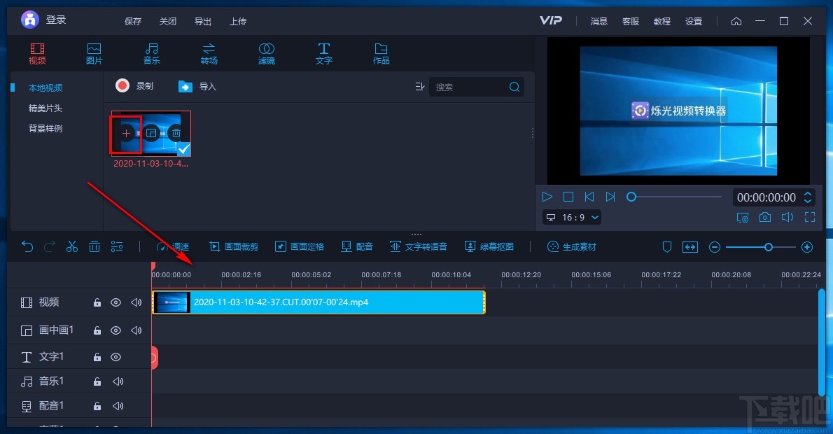 4.将视频添加到软件后,我们将鼠标移动到视频上,视频上会出现一个加号图标,点击该图标就可以将视频添加到下方的时间线上。