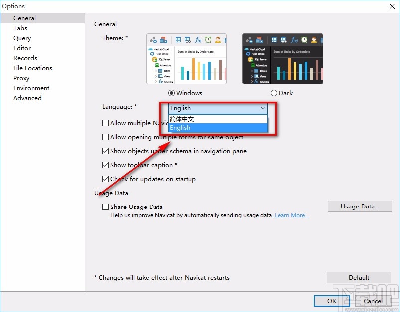 4.接下来我们在界面上找到“Language”选项,该选项表示语言的意思,点击该选项后面的下拉按钮,在下拉框中选择“简体中文”选项。