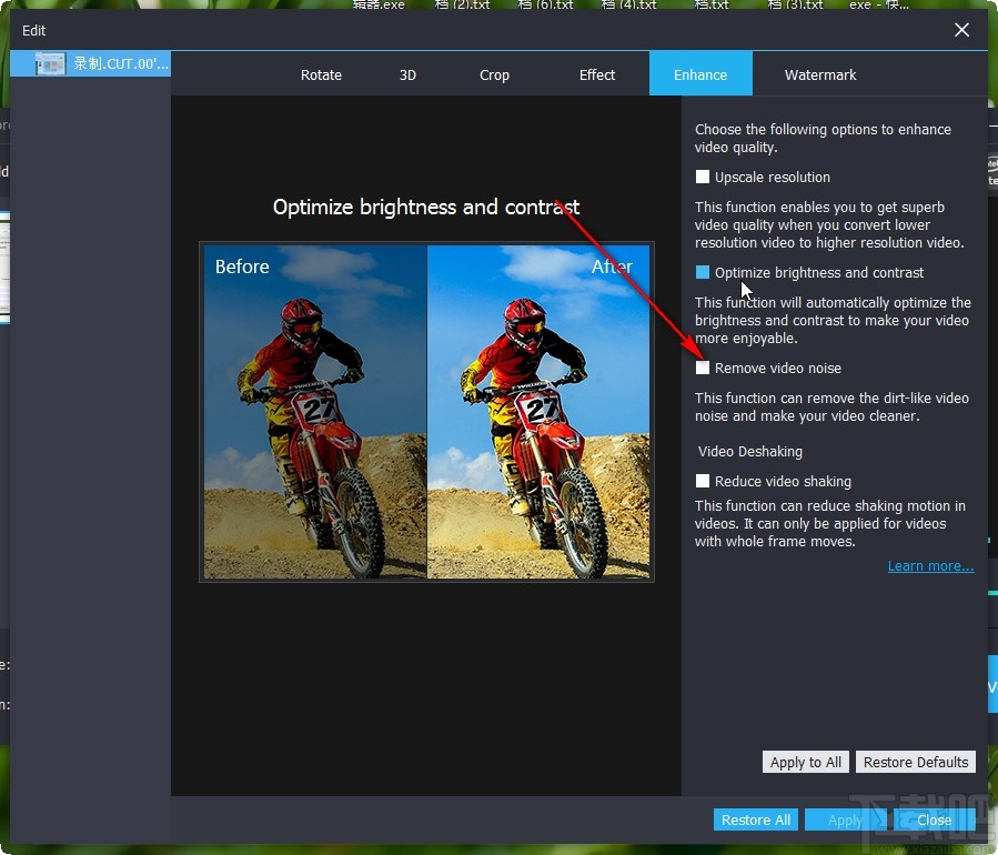 5.想要去除视频噪音的话,我们找到其中的第三个增强功能Remove video noise,也就是去除视频噪音的功能,需要点击勾选它左边的方框。