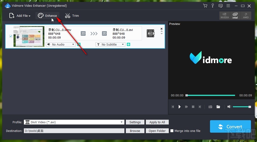 3.成功将这个视频添加到软件界面之后,下一步点击界面上方的Enhance这个效果设置选项,点击之后进入到其中准备设置视频效果。