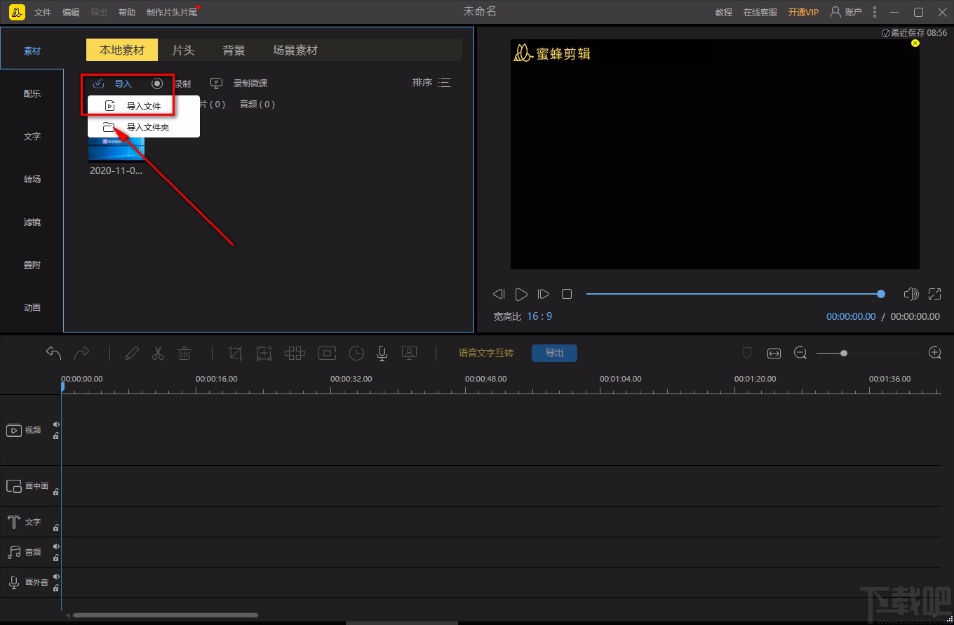 1.首先打开软件,我们在界面左上方点击“导入”按钮,其下方会出现一个下拉框,我们在下拉框中选择“导入文件”选项,就可以将视频添加到软件中。