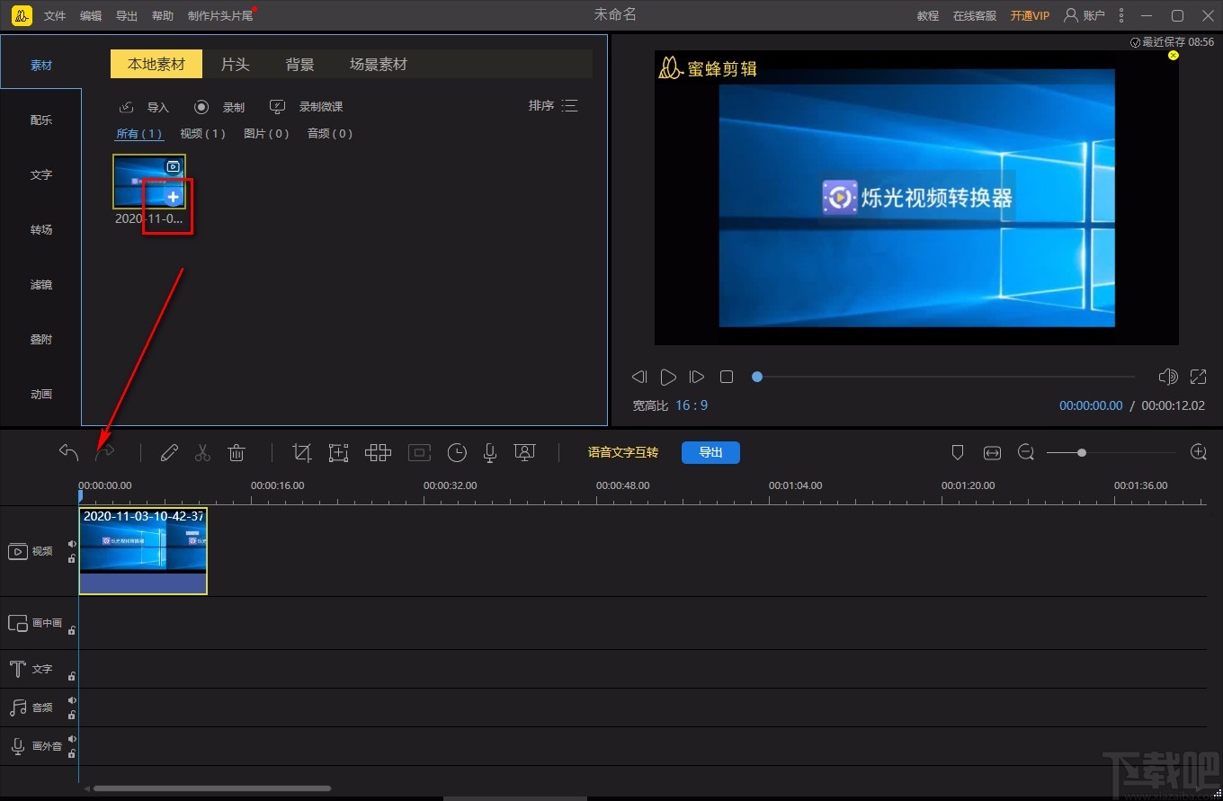 2.将视频添加到软件后,我们将鼠标移动到视频上,这时候视频上会出现一个加号图标,我们点击该图标就可以将视频添加到下方的时间线上。
