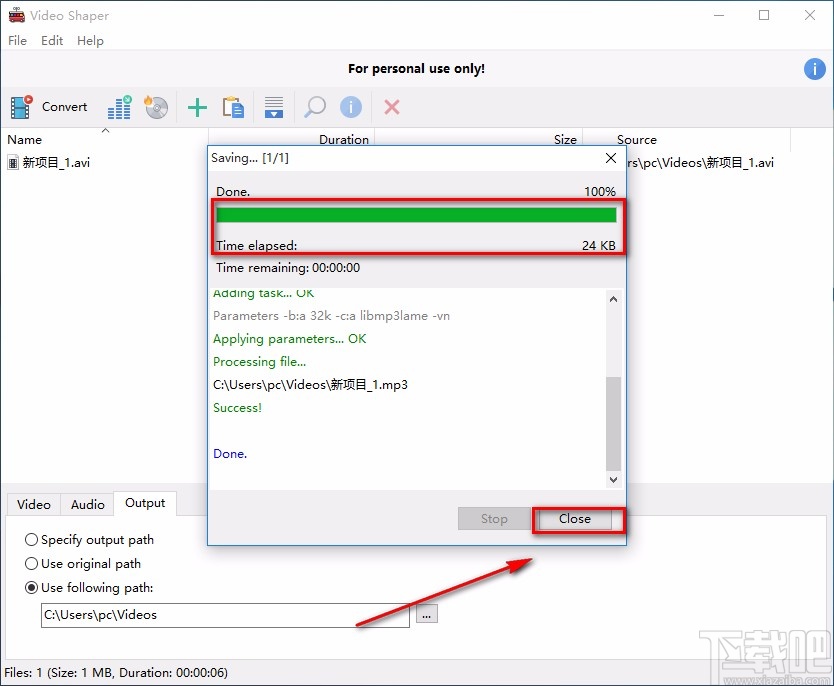 7.音频提取的速度非常快;提取结束后,界面上会出现一个完成的提示窗口,在窗口中可以看到完成进度是100%,这时候点击窗口右下角的“Close”按钮就可以了。