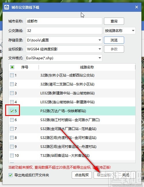 6.设置好输出保存路径之后,最后一步勾选想要下载的公交线路之后,点击右下角的导出坐标按钮即可导出保存,软件授权之后就可以顺利进行下载了。