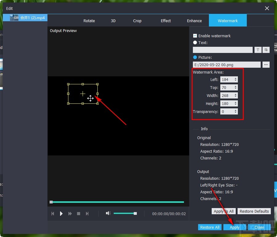 7.点击这个打开按钮之后,下一步我们就可以调整水印的位置了,可以直接移动进行调整,也可以在右边输入位置的坐标数值,点击下方的Apply应用按钮应用修改。
