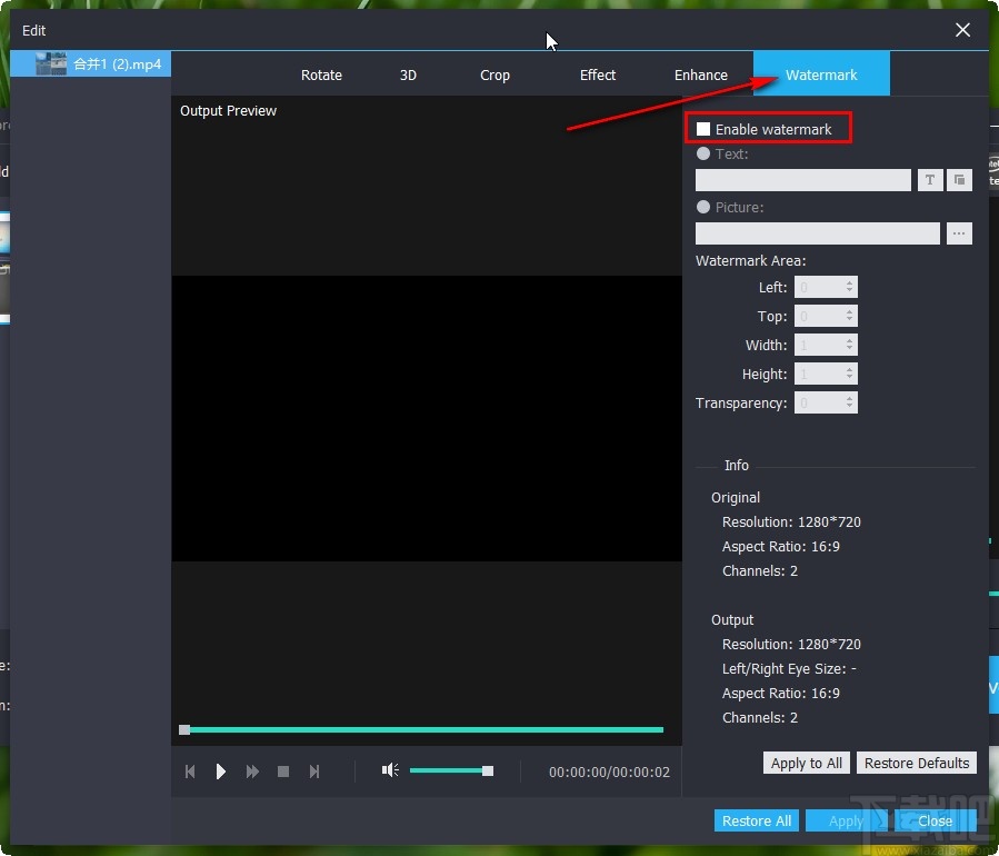 4.接下来进入到视频的编辑界面之后,我们找到Watermark这个选项之后,点击切换到其中,然后找到“Enable watermark”这个选项并点击选择。