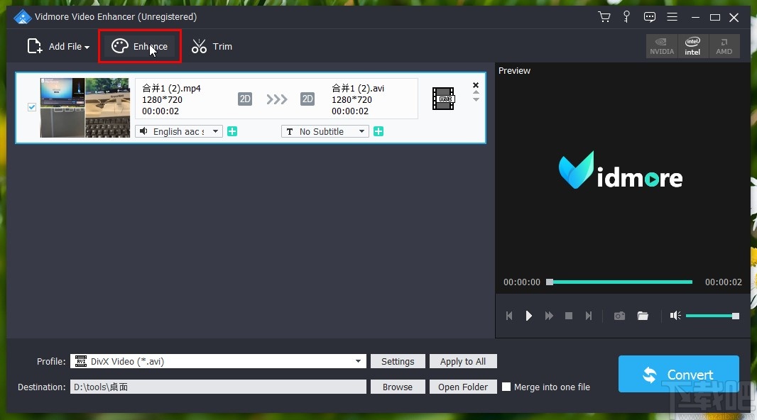 3.点击这个打开按钮之后,接下来下一步点击界面上方的Enhance这个视频增强选项,进入到视频的编辑界面当中。