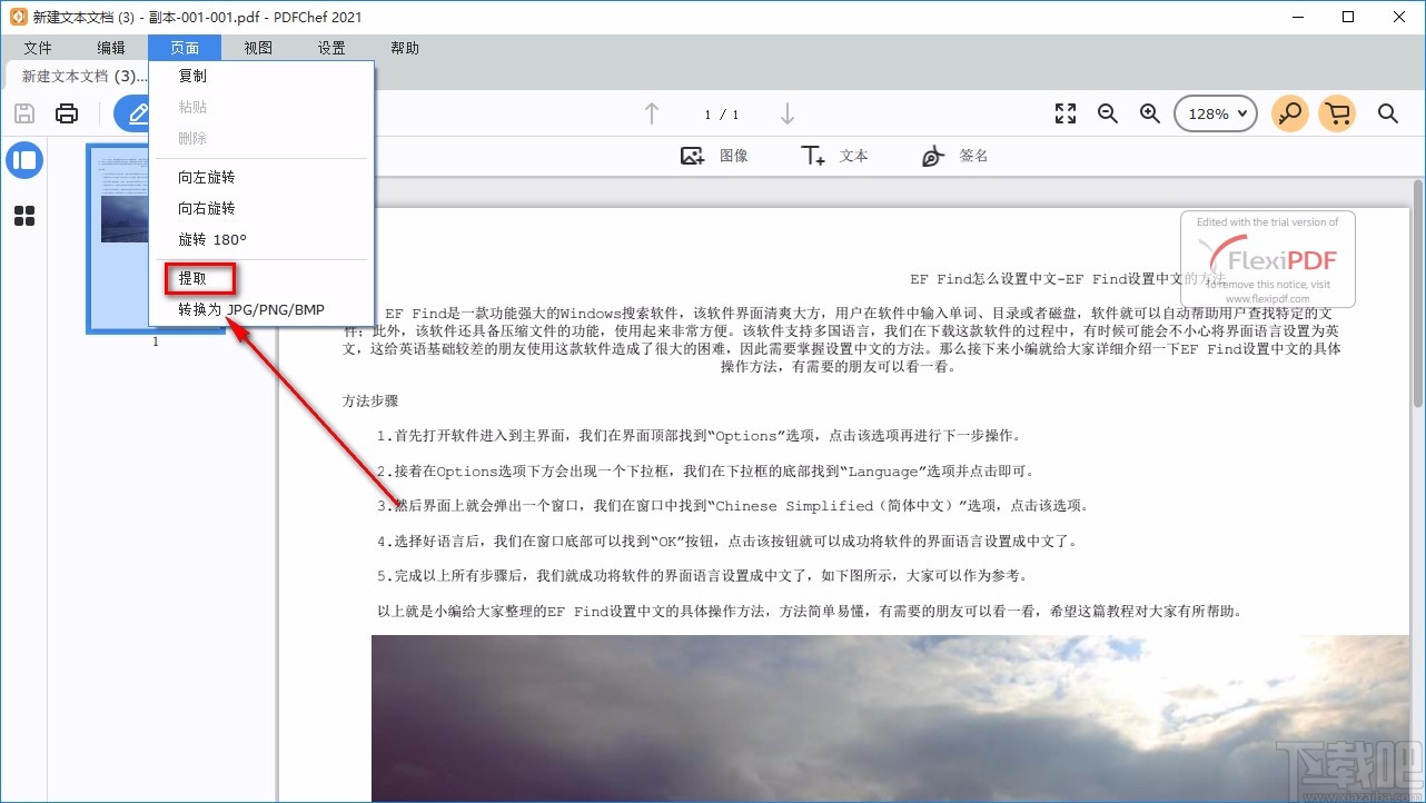 4.随后在“页面”选项下方会出现一个下拉框,我们在下拉框中可以看到很多操作选项,在这些选项中点击“提取”选项。