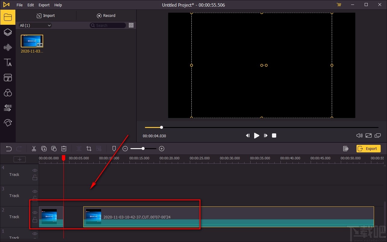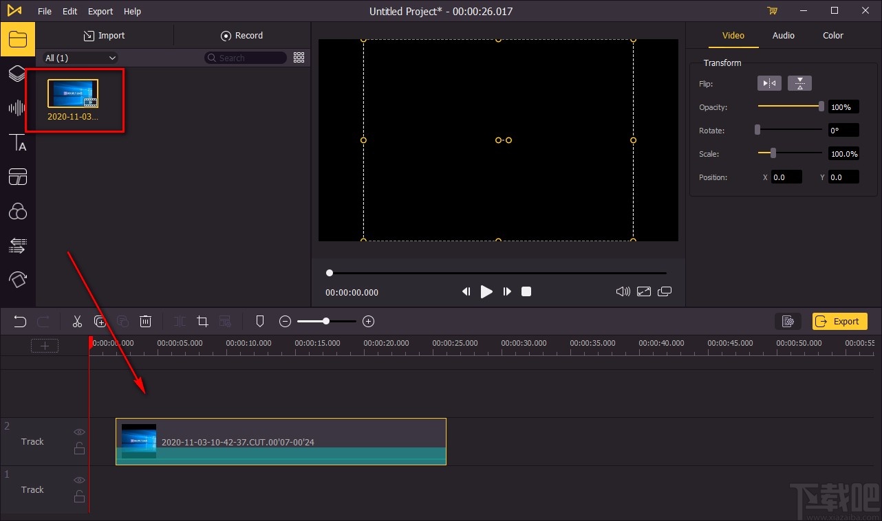3.将视频添加到软件后,我们在界面左上方选中视频,并将其拖拽到下方的时间线上。