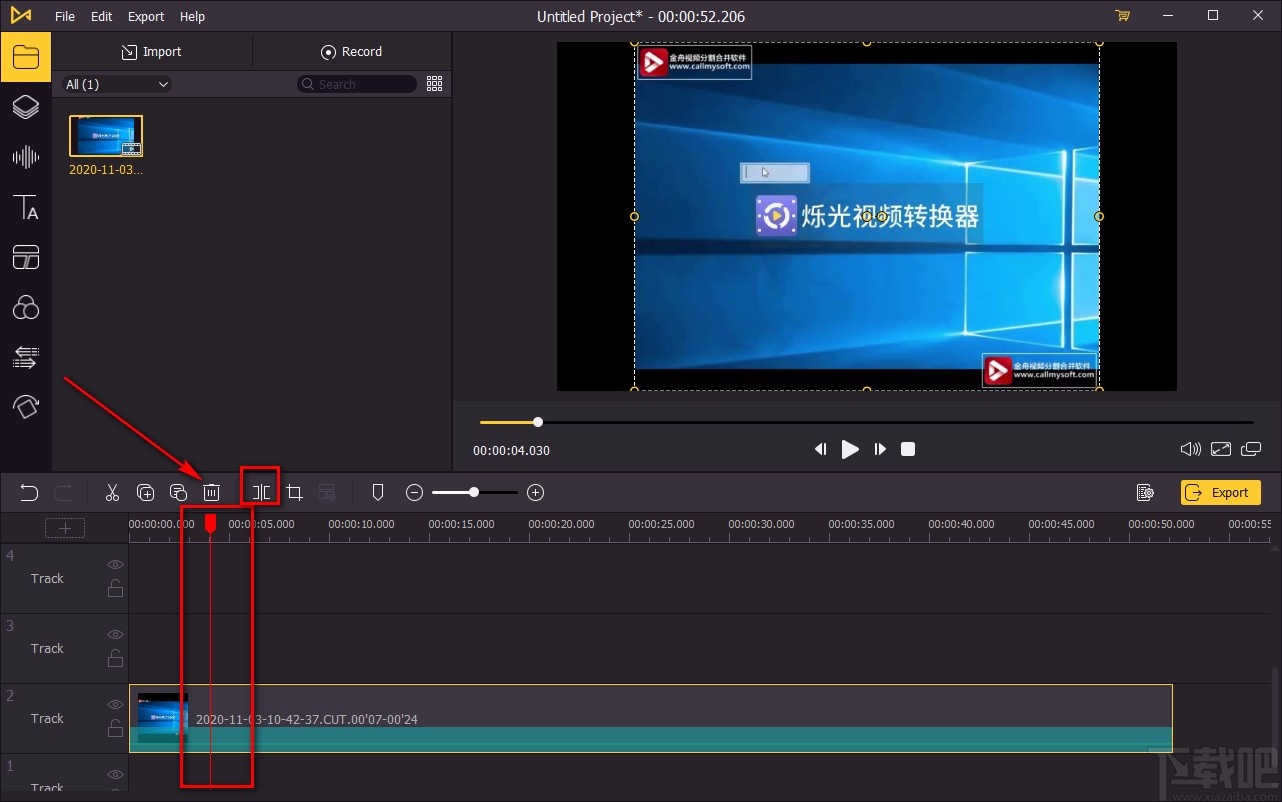 4.接着在时间线可以看到一条红色光标,我们向右移动光标使其至视频分割的位置,并点击时间线上方的分割按钮。