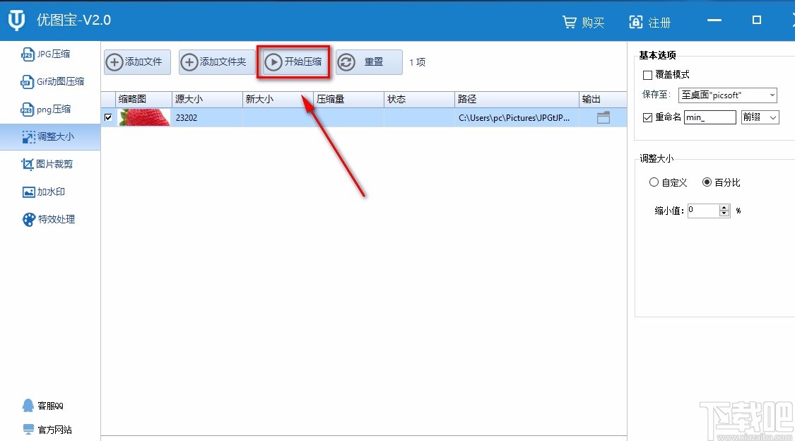 7.完成以上所有步骤后,我们在界面左上方找到“开始压缩”按钮,点击该按钮就可以开始调整图片大小了。