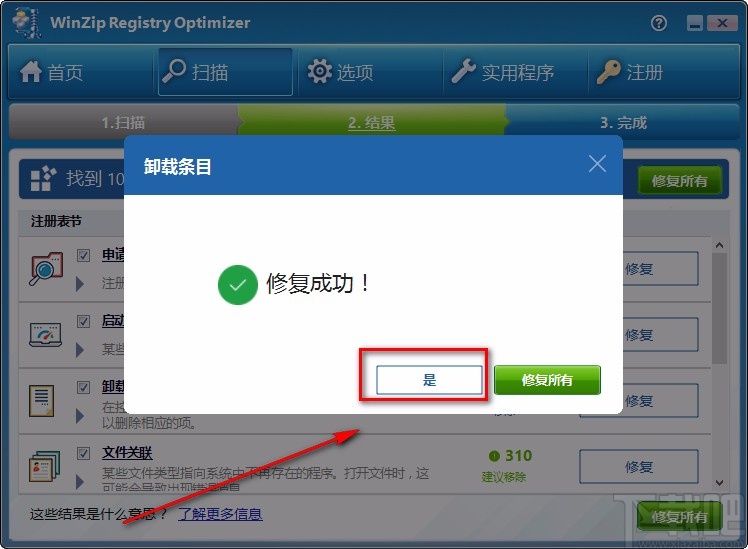 7.比如小编选择修复其中一个注册表,修复成功后,界面上会弹出一个修复成功的提示窗口,我们这时候点击窗口中的“是”按钮,就可以完成全部的操作步骤。