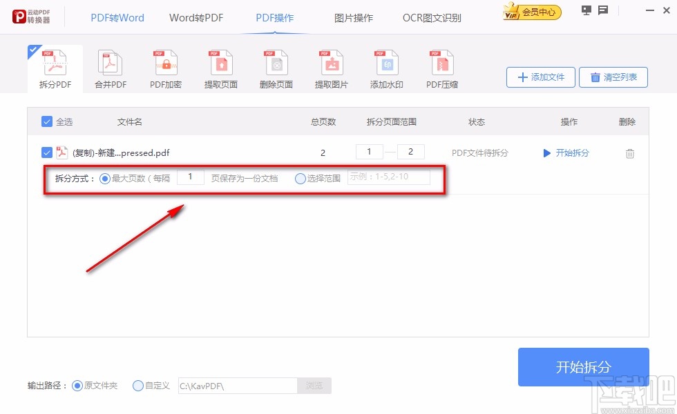 6.随后在界面上找到“拆分方式”选项,我们根据自己的需要在其后面设置拆分方式;并在对应方式后面的文本框中输入相应的页码数值。
