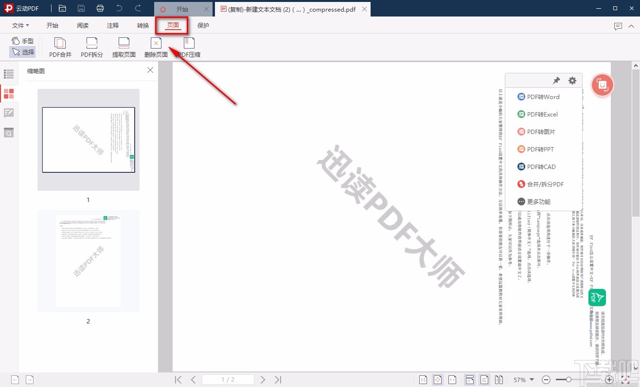 3.将PDF文件添加到软件后,我们在界面上方找到“页面”选项,点击该选项再进行下一步操作。