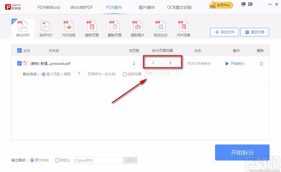 5.接下来在PDF拆分页面中,我们在页面上找到“拆分页面范围”选项,其下方有两个文本框,我们在文本框中输入需要进行拆分操作的页码数值。