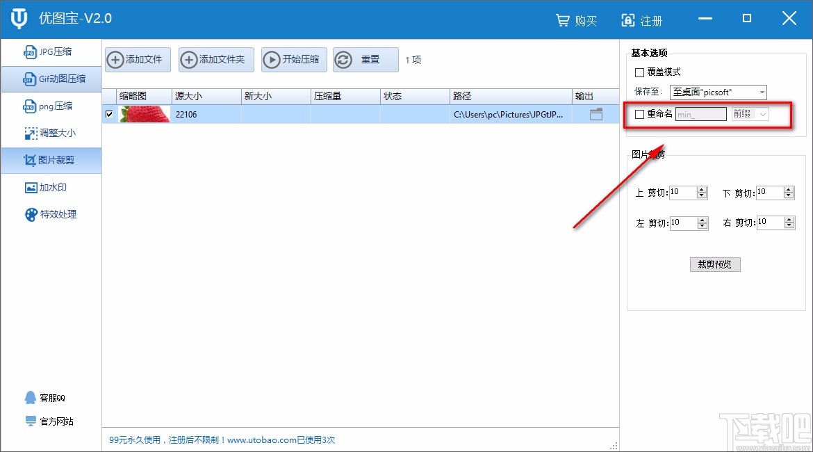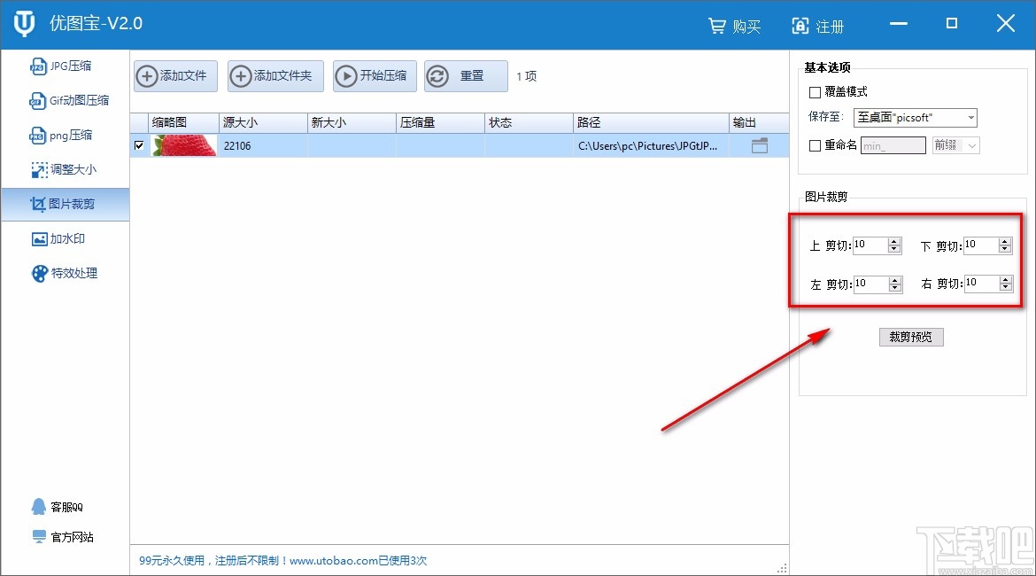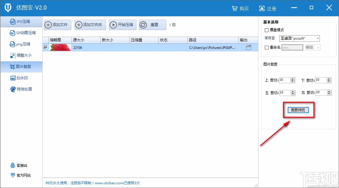 优图宝是一款非常实用的专业图片无损压缩软件,该软件主打图片压缩功能,同时还可以对图片进行其他的编辑处理操作,比如调整图片大小、裁剪图片以及给图片添加水印等。在对图片进行后期处理的过程中,我们常常会做到裁剪图片的操作。比如在上传图片到一些平台上的时候,如果图片不满足平台的尺寸要求,就可以通过裁剪方式调整图片的尺寸。鉴于很多朋友不知道怎么对其操作,那么接下来小编就给大家详细介绍一下优图宝裁剪图片的具体操作方法,有需要的朋友可以看一看并收藏起来。