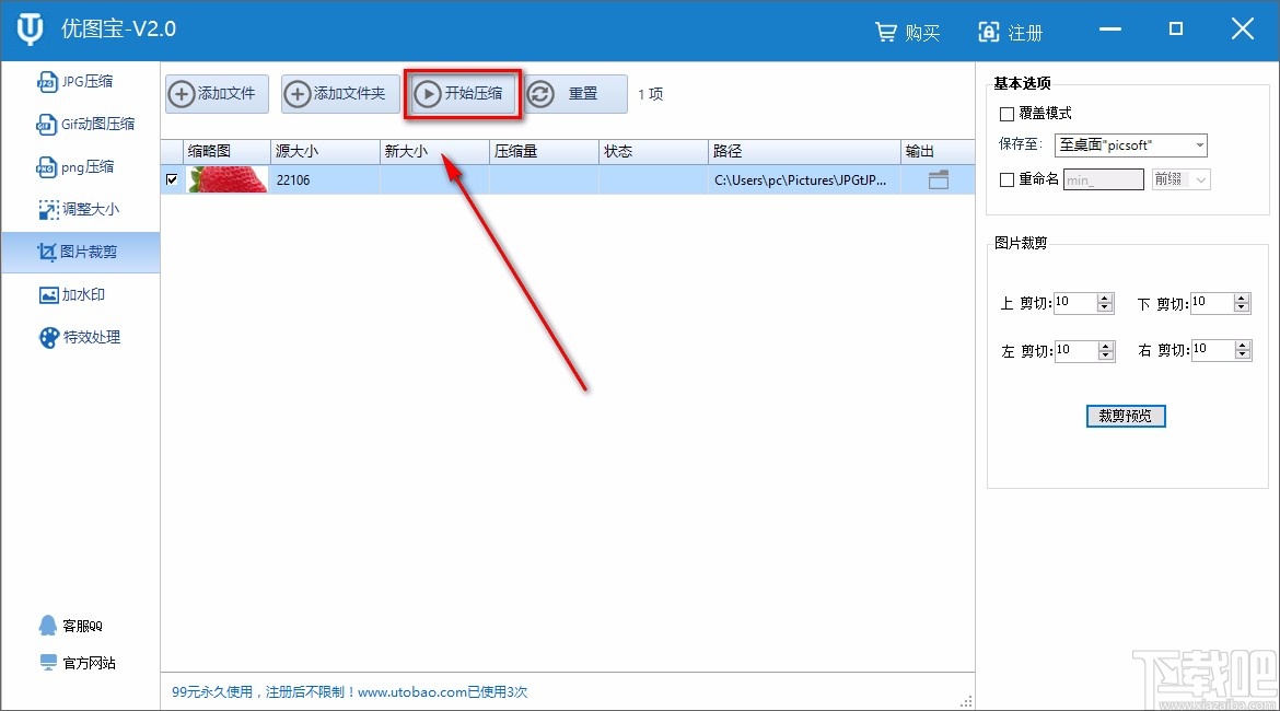 8.完成以上所有步骤后,我们在界面上方找到“开始压缩”按钮,点击该按钮就可以开始裁剪图片了。