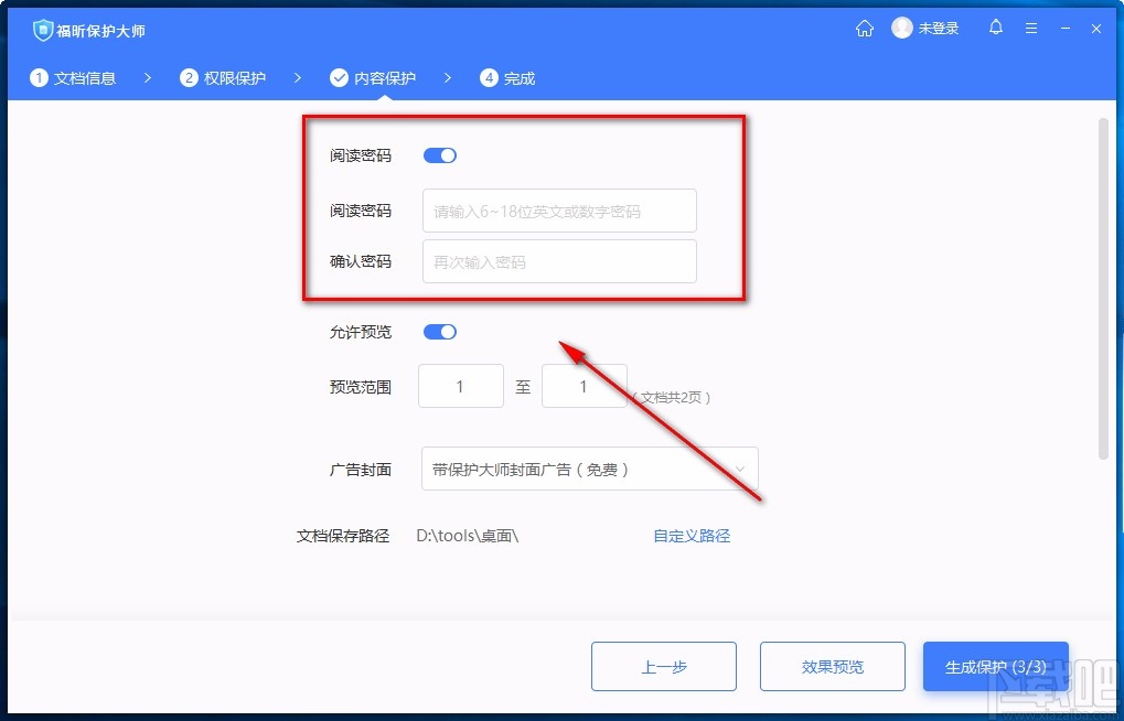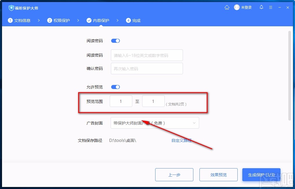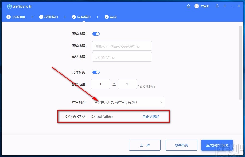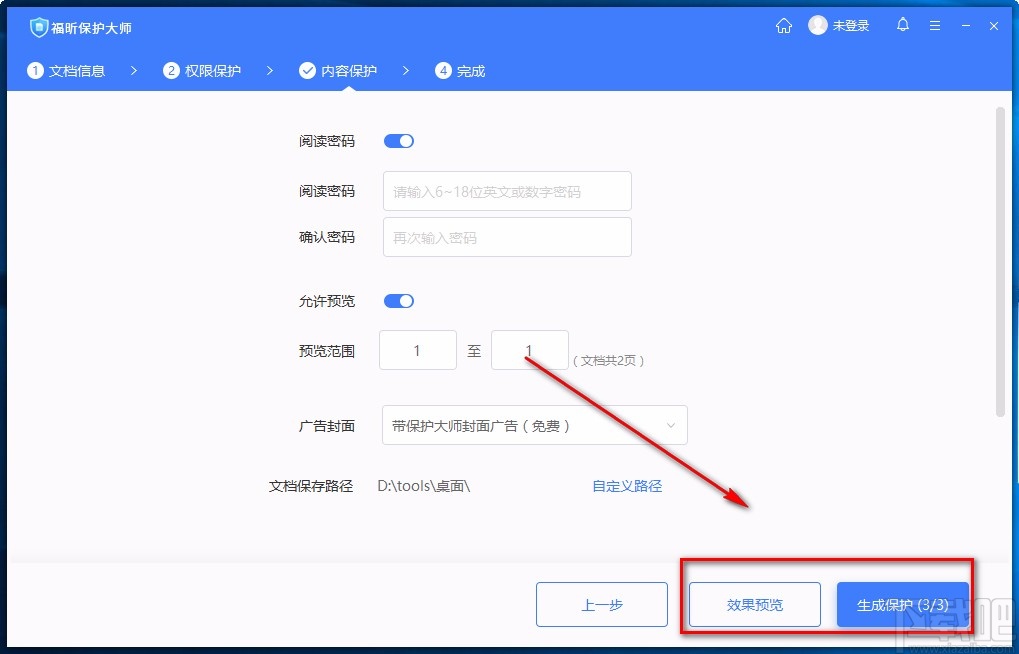 10.完成以上所有步骤后,我们在界面右下角可以点击“效果预览”按钮查看加密后的效果;再点击“生成保护”按钮,就可以成功加密PDF了。