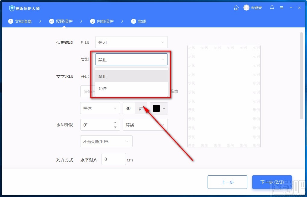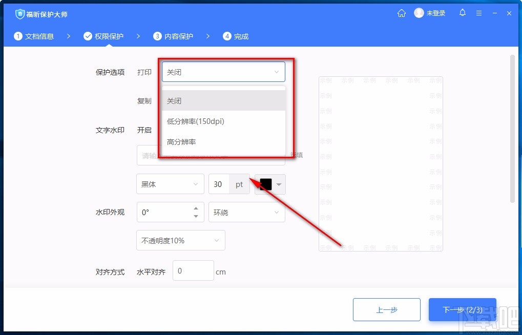 3.接着在页面上找到“保护选项”,该选项后面有一个“打印”选项,我们点击该选项后面的下拉按钮,在下拉框中就可以设置打印权限。