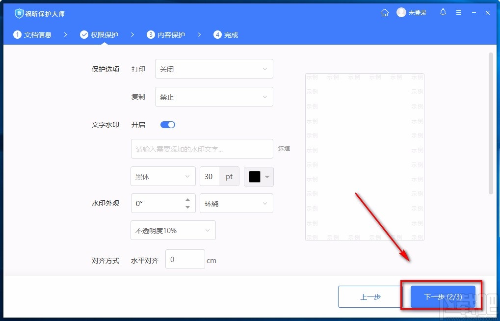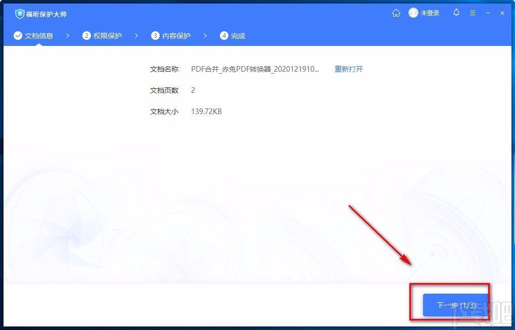 2.将PDF文件添加到软件后,我们在界面右下角找到“下一步”按钮,点击该按钮就可以进入到权限保护页面。