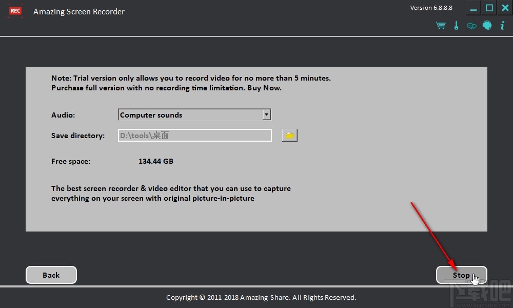 5.录制到合适的时间之后,我们点击放大窗口,再点击右下角的Stop这个停止按钮就可以停止录制了,如下图中所示。
