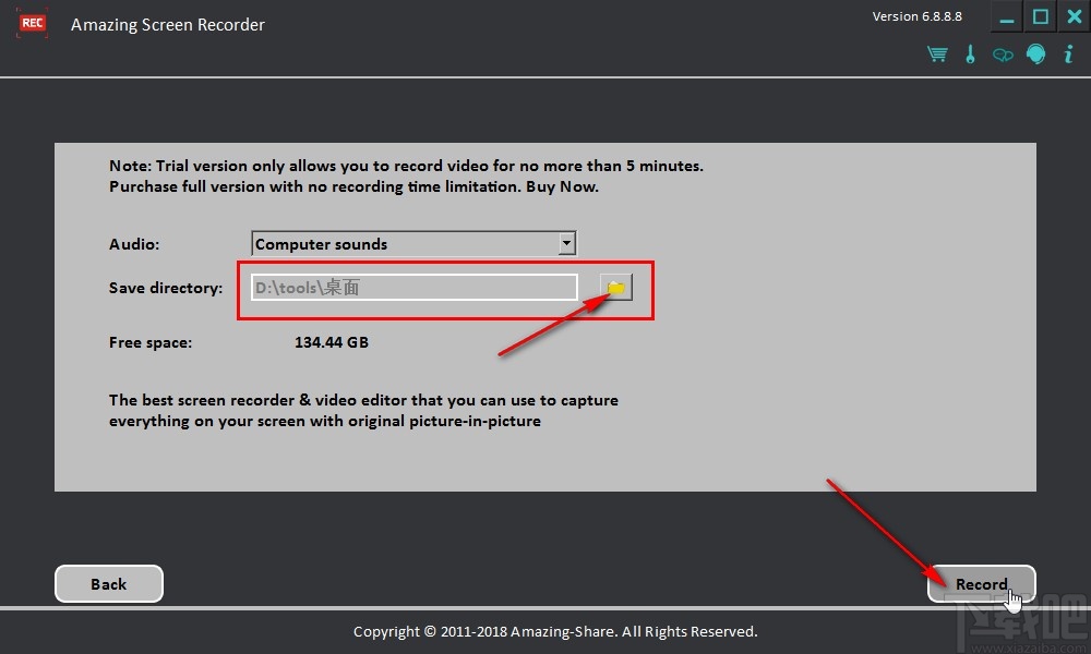 3.选择之后下一步在选择保存路径的选项中,点击右边的文件夹图标可以选择设置录制视频的输出保存位置,在界面的右下角点击Record这个录制按钮即可开始录制。