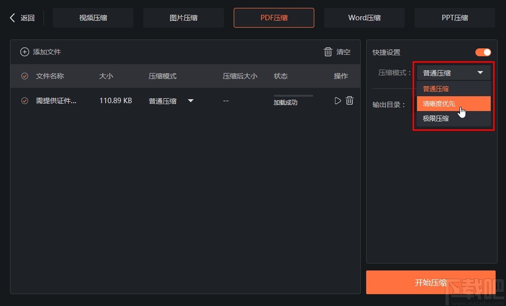 4.点击打开之后将PDF文件成功添加到软件界面,然后点击右边快捷设置选项中的压缩模式这个选项,点击下拉列表之后选择想要使用的压缩方式。