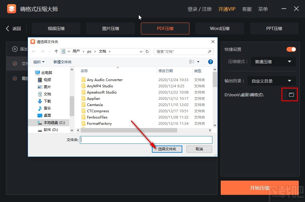 5.选择好压缩方式之后,将输出目录选择为自定义目录,然后点击文件夹图标可以打开选择文件输出目录的界面,选择好输出目录之后点击选择文件夹即可。