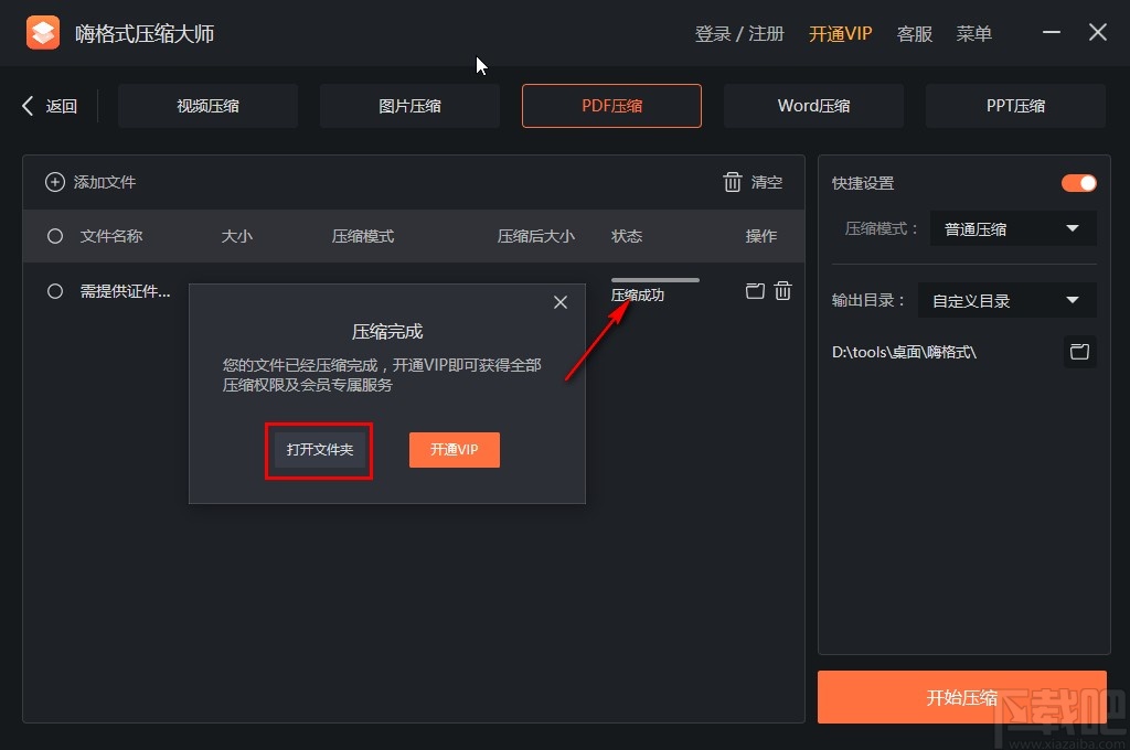 7.开始压缩文件之后等到压缩操作完成,然后在界面的状态中可以看到显示为压缩成功,在弹出的压缩完成提示界面可以点击“打开文件夹”按钮打开查看压缩好的文件。