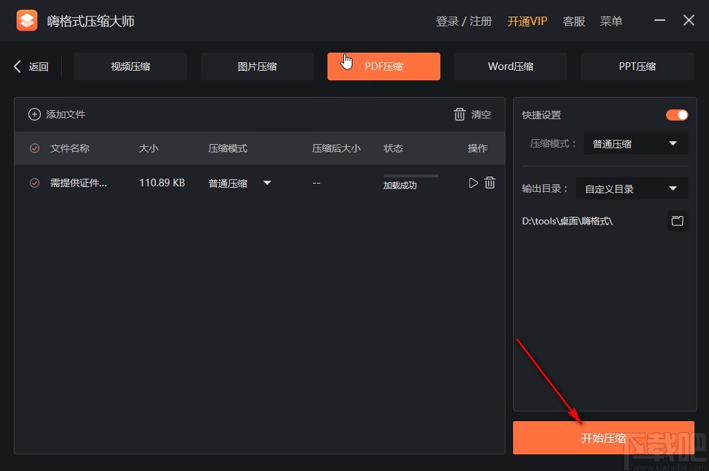 6.设置好输出文件夹之后,在界面右下角找到开始压缩这个功能按钮,然后点击这个开始压缩按钮开始压缩文件的操作。