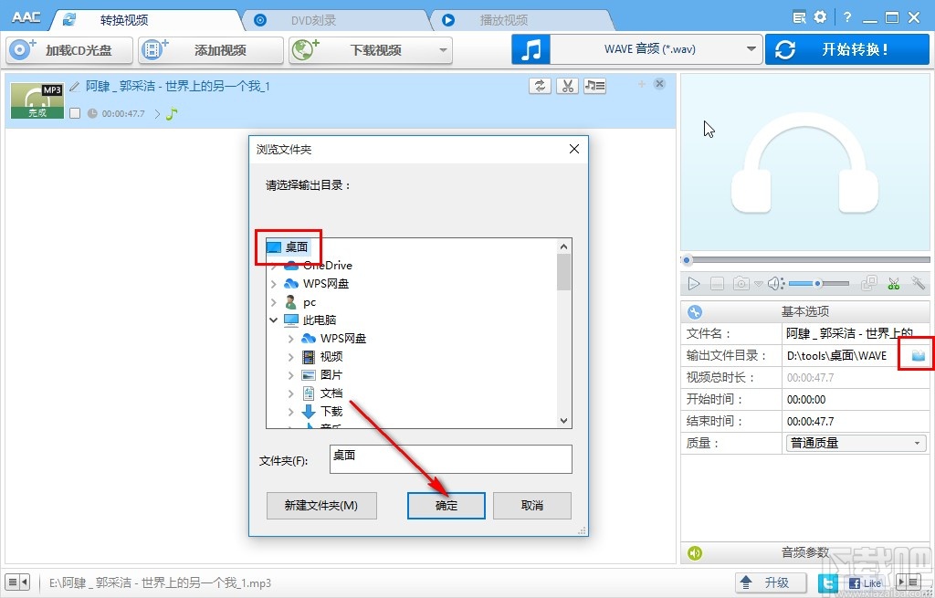 5.接下来我们需要点击右边的输出目录文件夹图标,点击之后在出现的界面中选择想要输出保存文件的界面,选择之后点击确定按钮。