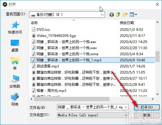 2.进入到选择添加媒体文件的界面之后,我们选中目标音频文件,然后点击右下角的打开按钮,将文件添加到软件界面。