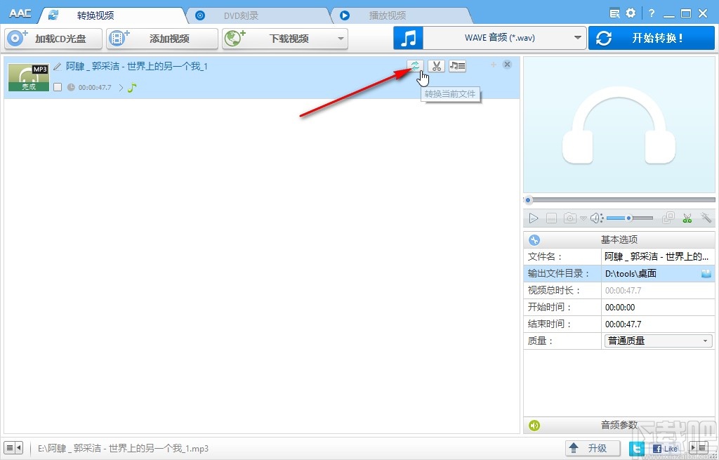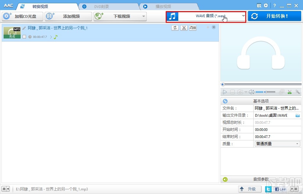6.设置好输出保存界面之后,在界面音频选项右边,找到开始转换图标点击之后即可开始转换,也可以点击右上角的开始转换按钮开始转换操作。