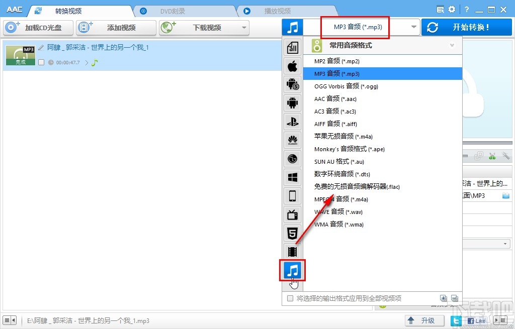 4.选择好想要转换的音频格式之后,如下图中所示,我们可以看到显示的音频格式是自己选择想要使用的那一个。