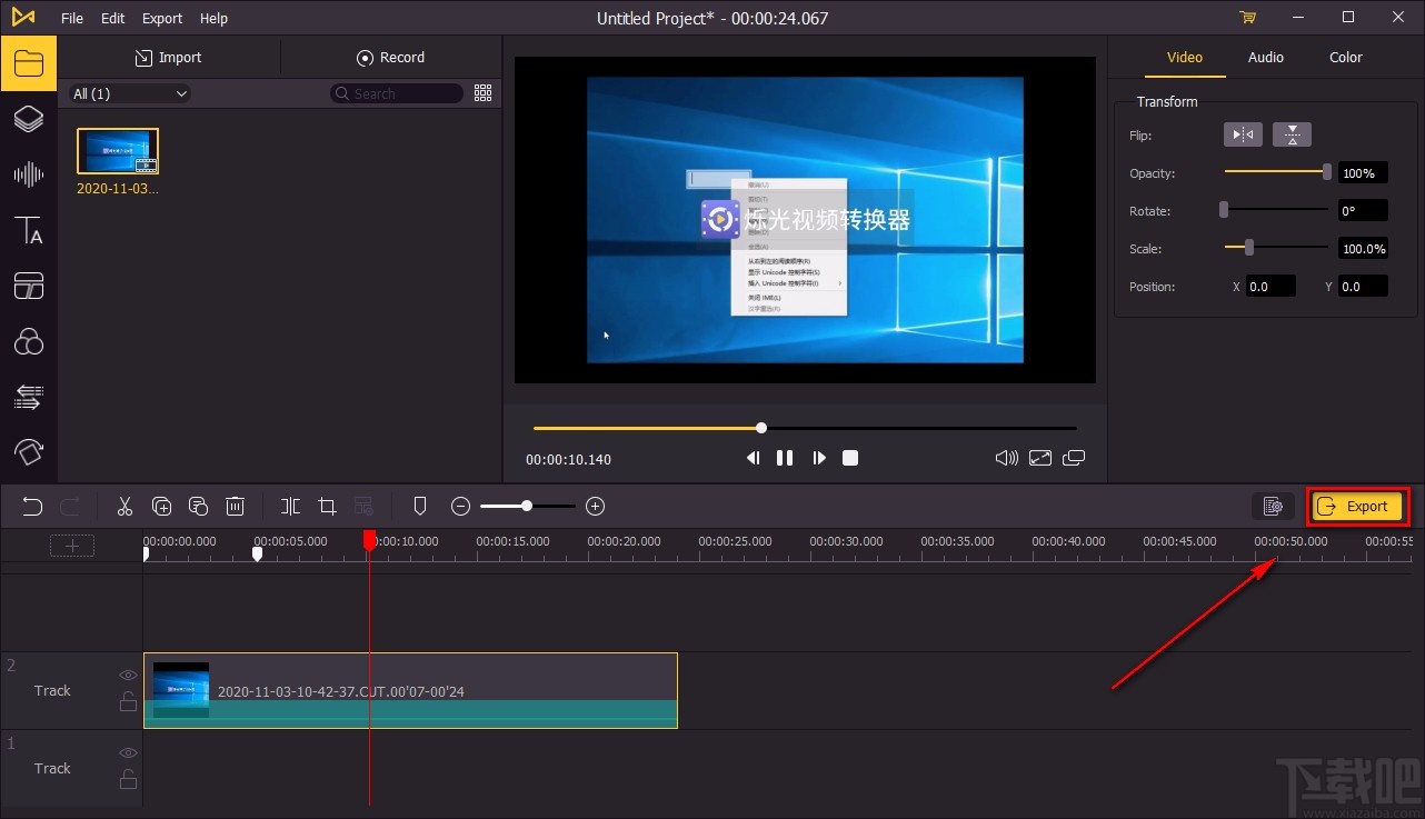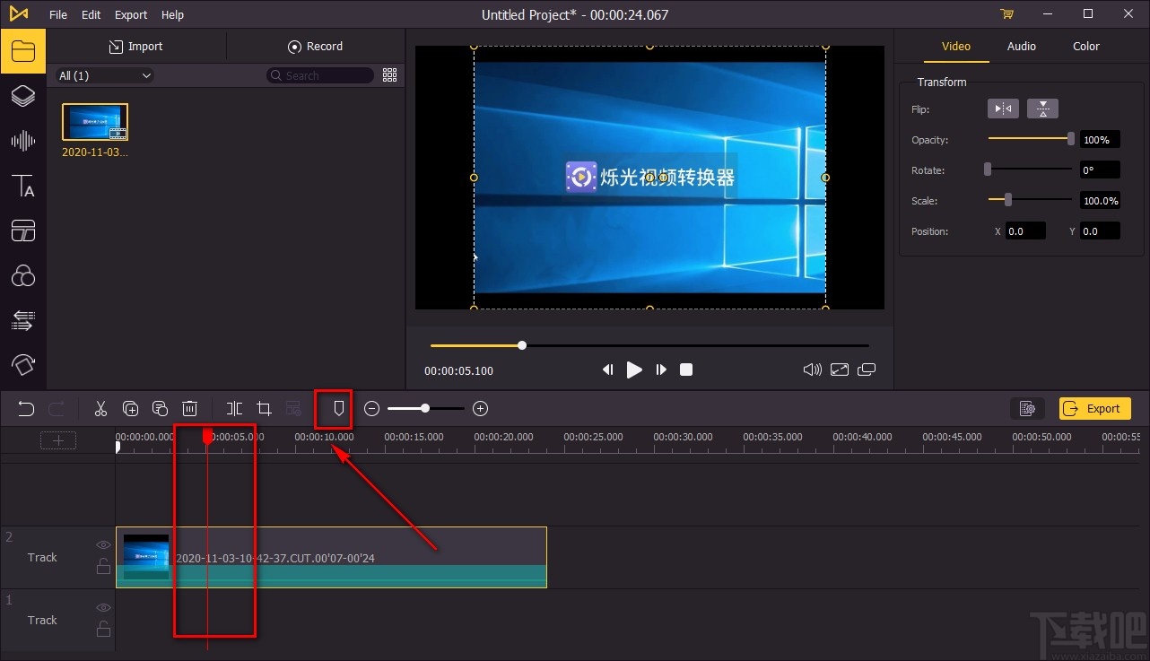 3.将视频文件添加到软件后,我们在界面左上方选中视频,将用鼠标将其拖动到下方的时间线上。