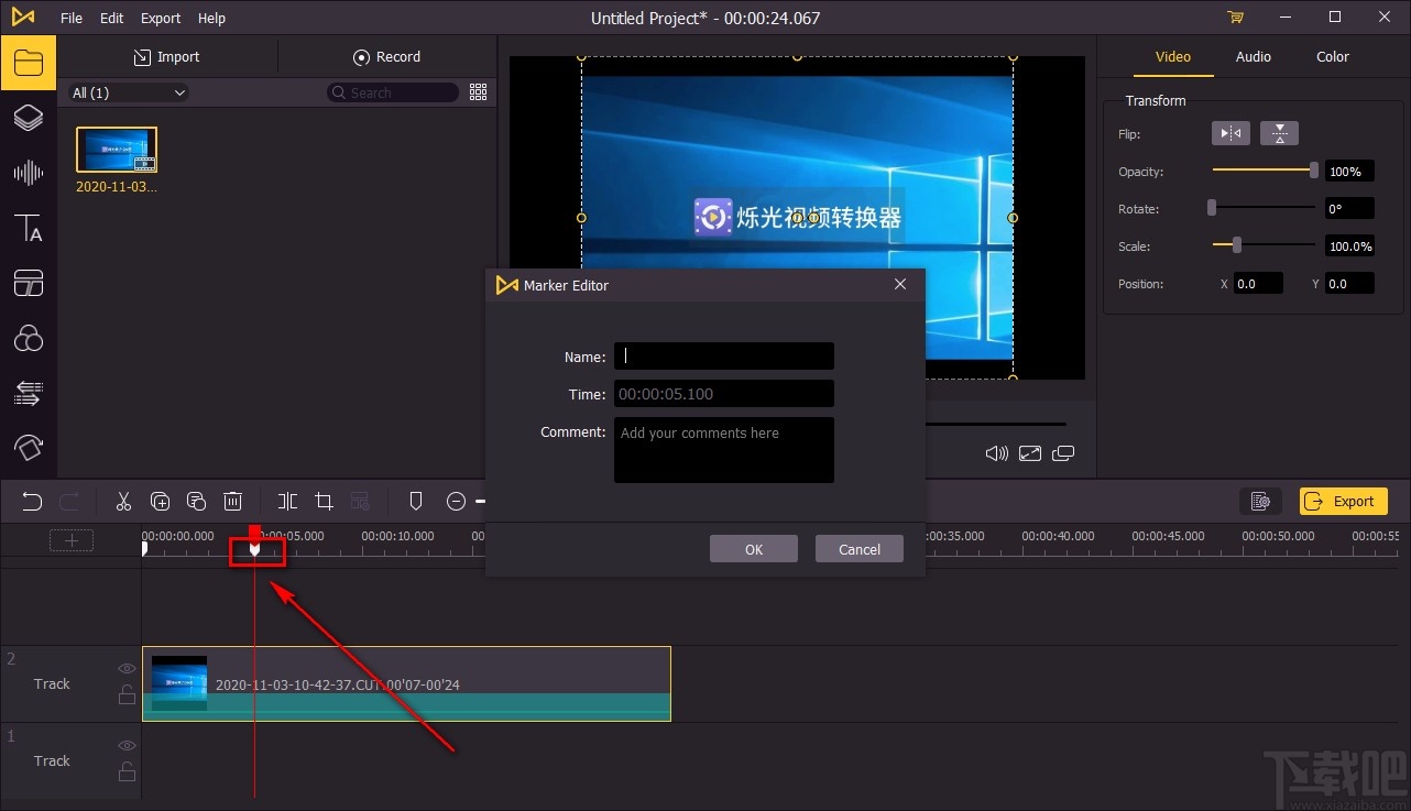 4.接着在时间线上可以找到一个红色的光标,我们移动这条光标,使其到需要添加标签的位置,并点击时间线上方的标签按钮,如下图所示。