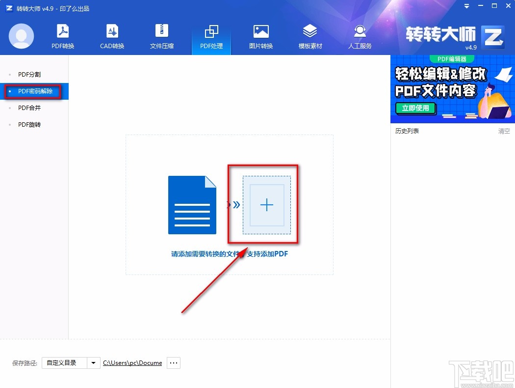 2.接着在PDF处理页面中,我们在页面左侧找到“PDF密码解除”选项并点击,再点击页面正中间的加号图标按钮即可。