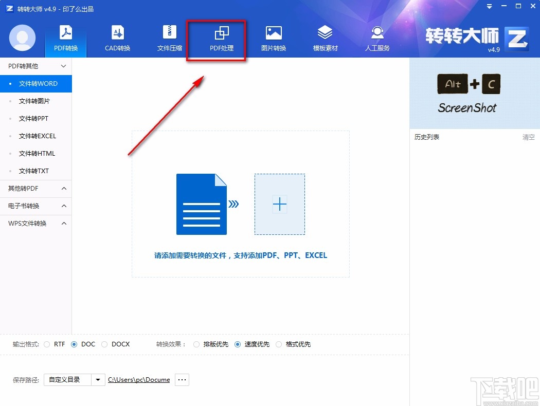 1.首先打开软件,我们在界面上方找到“PDF处理”选项,点击该选项就可以进入到PDF处理页面。