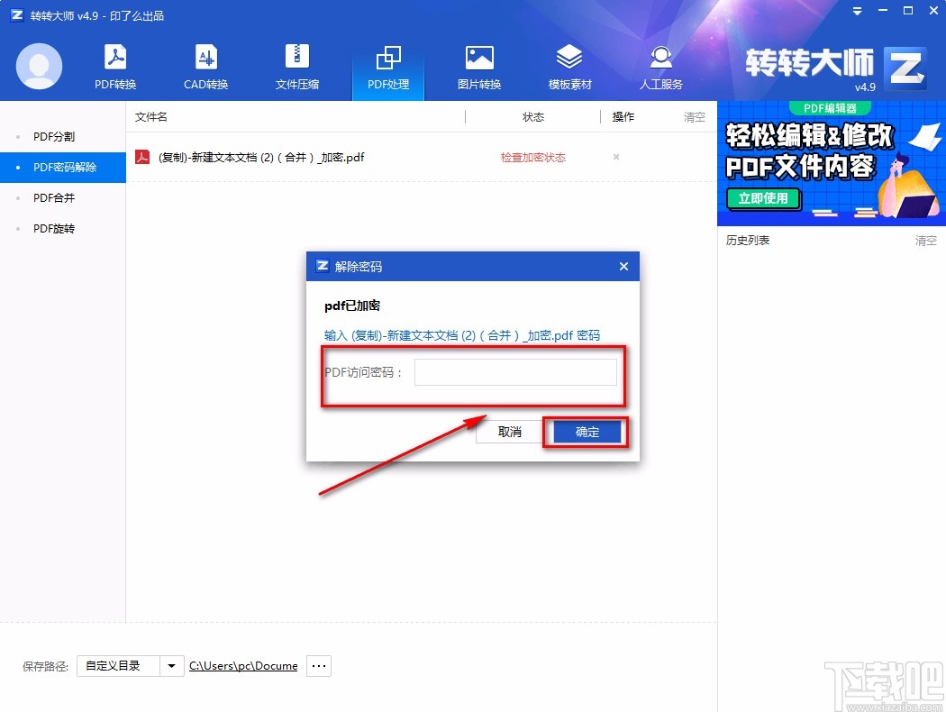 4.紧接着界面上就会出现一解除密码窗口,我们在窗口中的文本框中输入PDF的访问密码后,再点击窗口中的“确定”按钮就可以了。