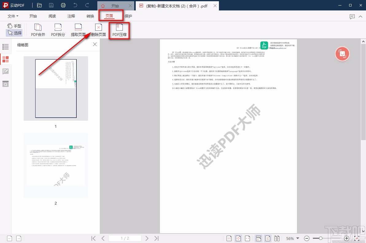 3.将PDF文件打开后,我们在界面上方找到“页面”选项并点击,之后在其下方选择“PDF压缩”选项。