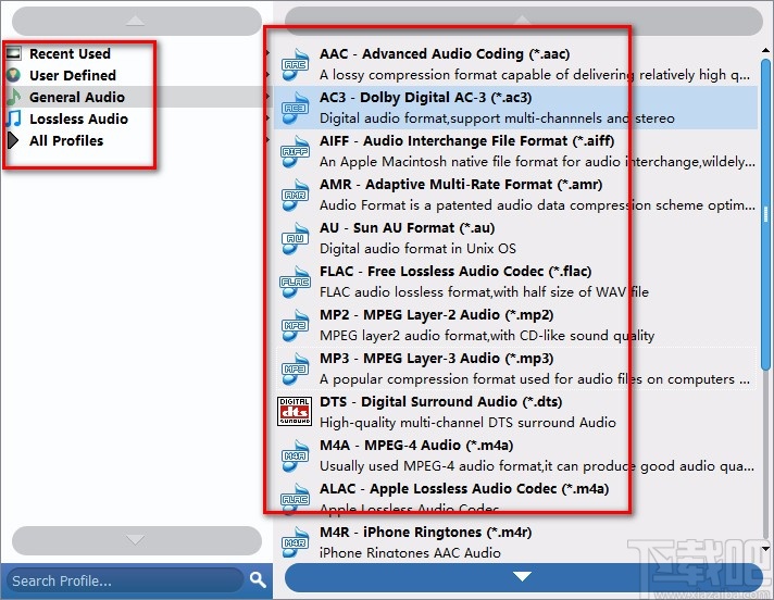 3.将音频文件添加到软件后,我们在界面下方找到“Profile”选项,其后面有一个下拉按钮,点击该按钮再进行下一步操作。
