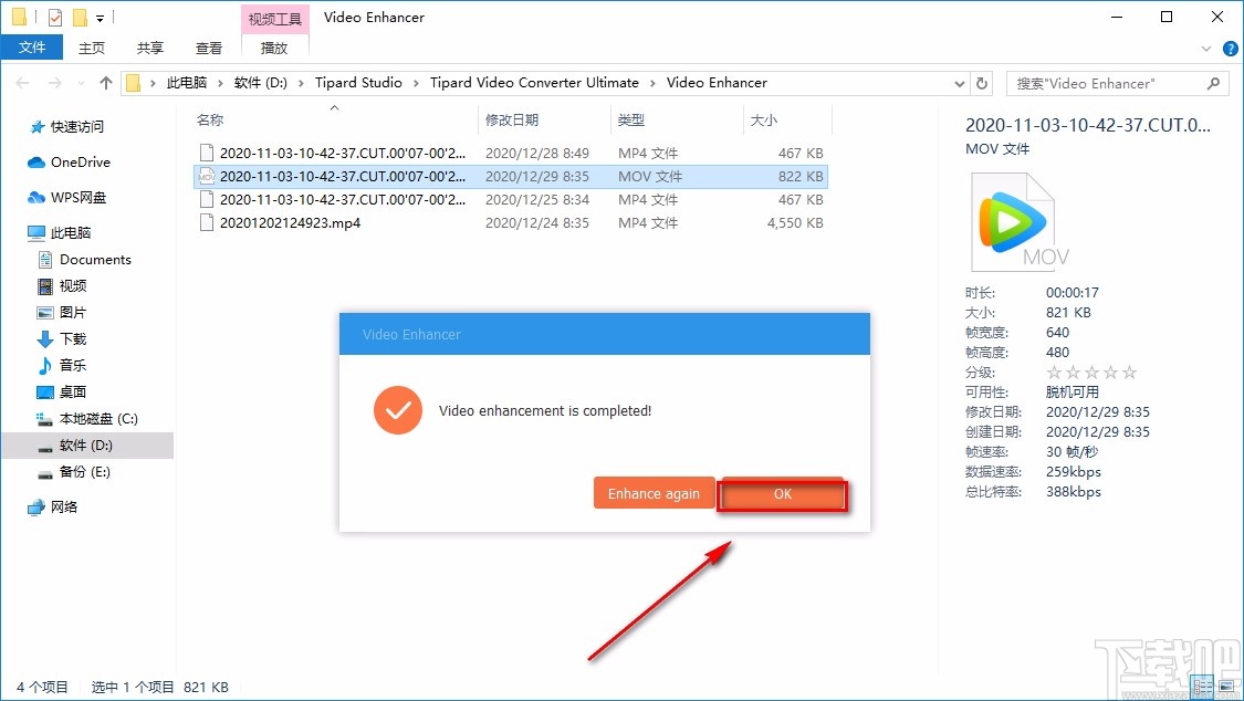 9.给视频减震后,视频的输出文件夹就会自动打开,这时候界面上会出现一个视频优化完成的提示窗口,我们点击窗口右下角的“OK”按钮就可以了。